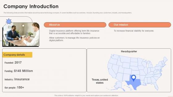 The following slide provides information about insurance technology company. It covers facilities such as overview, mission, founding year, customers, industry, and headquarters. Slidegeeks is one of the best resources for PowerPoint templates. You can download easily and regulate Company Introduction Term Life Insurance Platform Investor Funding Elevator Pitch Deck for your personal presentations from our wonderful collection. A few clicks is all it takes to discover and get the most relevant and appropriate templates. Use our Templates to add a unique zing and appeal to your presentation and meetings. All the slides are easy to edit and you can use them even for advertisement purposes. The following slide provides information about insurance technology company. It covers facilities such as overview, mission, founding year, customers, industry, and headquarters.