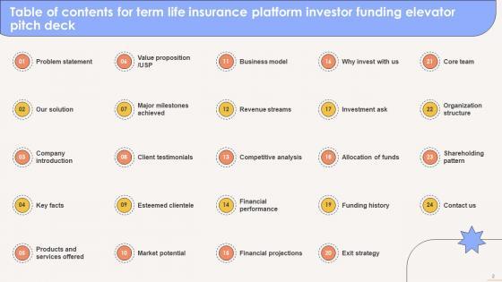 Welcome to our selection of the Table Of Contents For Term Life Insurance Platform Investor Funding Elevator Pitch Deck. These are designed to help you showcase your creativity and bring your sphere to life. Planning and Innovation are essential for any business that is just starting out. This collection contains the designs that you need for your everyday presentations. All of our PowerPoints are 100Percent editable, so you can customize them to suit your needs. This multi-purpose template can be used in various situations. Grab these presentation templates today. Our Table Of Contents For Term Life Insurance Platform Investor Funding Elevator Pitch Deck are topically designed to provide an attractive backdrop to any subject. Use them to look like a presentation pro.