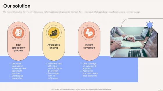 This slide exhibits solutions offered by online life insurance platform to address challenges faced by individuals. These solutions include fast application process, affordable process, and instant coverage. Make sure to capture your audiences attention in your business displays with our gratis customizable Our Solution Term Life Insurance Platform Investor Funding Elevator Pitch Deck. These are great for business strategies, office conferences, capital raising or task suggestions. If you desire to acquire more customers for your tech business and ensure they stay satisfied, create your own sales presentation with these plain slides. This slide exhibits solutions offered by online life insurance platform to address challenges faced by individuals. These solutions include fast application process, affordable process, and instant coverage.