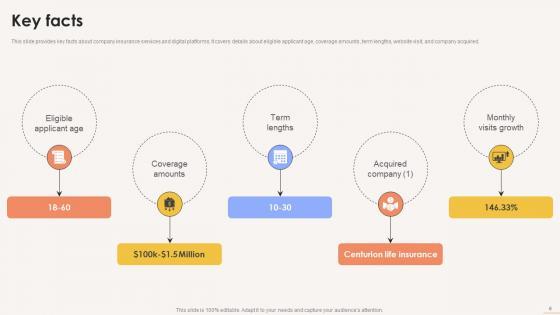 This slide provides key facts about company insurance services and digital platforms. It covers details about eligible applicant age, coverage amounts, term lengths, website visit, and company acquired. If your project calls for a presentation, then Slidegeeks is your go-to partner because we have professionally designed, easy-to-edit templates that are perfect for any presentation. After downloading, you can easily edit Key Facts Term Life Insurance Platform Investor Funding Elevator Pitch Deck and make the changes accordingly. You can rearrange slides or fill them with different images. Check out all the handy templates This slide provides key facts about company insurance services and digital platforms. It covers details about eligible applicant age, coverage amounts, term lengths, website visit, and company acquired.