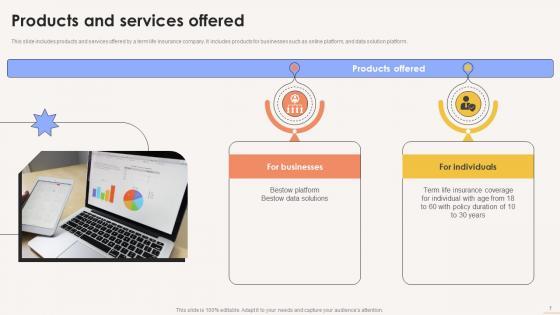 This slide includes products and services offered by a term life insurance company. It includes products for businesses such as online platform, and data solution platform. Coming up with a presentation necessitates that the majority of the effort goes into the content and the message you intend to convey. The visuals of a PowerPoint presentation can only be effective if it supplements and supports the story that is being told. Keeping this in mind our experts created Products And Services Offered Term Life Insurance Platform Investor Funding Elevator Pitch Deck to reduce the time that goes into designing the presentation. This way, you can concentrate on the message while our designers take care of providing you with the right template for the situation. This slide includes products and services offered by a term life insurance company. It includes products for businesses such as online platform, and data solution platform.