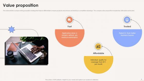 This slide exhibits a unique selling proposition strategy that helps to differentiate company products and services and develop a competitive advantage. The company value proposition includes fast, affordable and trusted. Explore a selection of the finest Value Proposition Term Life Insurance Platform Investor Funding Elevator Pitch Deck here. With a plethora of professionally designed and pre-made slide templates, you can quickly and easily find the right one for your upcoming presentation. You can use our Value Proposition Term Life Insurance Platform Investor Funding Elevator Pitch Deck to effectively convey your message to a wider audience. Slidegeeks has done a lot of research before preparing these presentation templates. The content can be personalized and the slides are highly editable. Grab templates today from Slidegeeks. This slide exhibits a unique selling proposition strategy that helps to differentiate company products and services and develop a competitive advantage. The company value proposition includes fast, affordable and trusted.