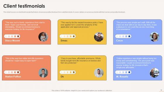 This slide focuses on client testimonials that help to showcase positive feedback from satisfied clients. It covers details on numerous clients with their names and positive feedback. Create an editable Client Testimonials Term Life Insurance Platform Investor Funding Elevator Pitch Deck that communicates your idea and engages your audience. Whether you are presenting a business or an educational presentation, pre-designed presentation templates help save time. Client Testimonials Term Life Insurance Platform Investor Funding Elevator Pitch Deck is highly customizable and very easy to edit, covering many different styles from creative to business presentations. Slidegeeks has creative team members who have crafted amazing templates. So, go and get them without any delay. This slide focuses on client testimonials that help to showcase positive feedback from satisfied clients. It covers details on numerous clients with their names and positive feedback.