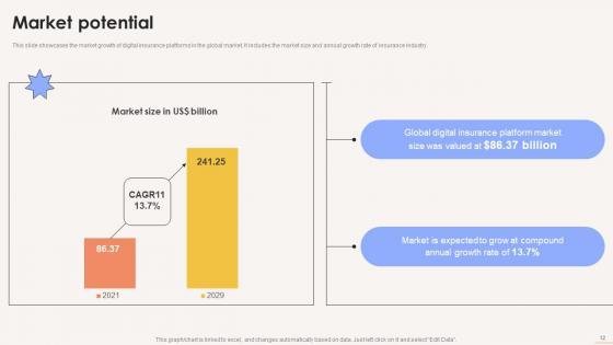 This slide showcases the market growth of digital insurance platforms in the global market. It includes the market size and annual growth rate of insurance industry. Are you in need of a template that can accommodate all of your creative concepts This one is crafted professionally and can be altered to fit any style. Use it with Google Slides or PowerPoint. Include striking photographs, symbols, depictions, and other visuals. Fill, move around, or remove text boxes as desired. Test out color palettes and font mixtures. Edit and save your work, or work with colleagues. Download Market Potential Term Life Insurance Platform Investor Funding Elevator Pitch Deck and observe how to make your presentation outstanding. Give an impeccable presentation to your group and make your presentation unforgettable. This slide showcases the market growth of digital insurance platforms in the global market. It includes the market size and annual growth rate of insurance industry.