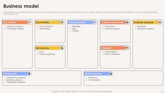 This slide focuses on the business model framework of term life insurance provider company. It covers elements such as key partners, activities, value propositions, customer relationships, key resources, distribution channels, revenue streams, etc. Boost your pitch with our creative Business Model Term Life Insurance Platform Investor Funding Elevator Pitch Deck. Deliver an awe-inspiring pitch that will mesmerize everyone. Using these presentation templates you will surely catch everyones attention. You can browse the ppts collection on our website. We have researchers who are experts at creating the right content for the templates. So you do not have to invest time in any additional work. Just grab the template now and use them. This slide focuses on the business model framework of term life insurance provider company. It covers elements such as key partners, activities, value propositions, customer relationships, key resources, distribution channels, revenue streams, etc.