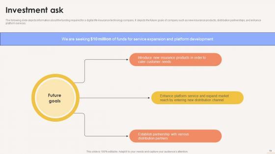 The following slide depicts information about the funding required for a digital life insurance technology company. It depicts the future goals of company such as new insurance products, distribution partnerships, and enhance platform services. Find highly impressive Investment Ask Term Life Insurance Platform Investor Funding Elevator Pitch Deck on Slidegeeks to deliver a meaningful presentation. You can save an ample amount of time using these presentation templates. No need to worry to prepare everything from scratch because Slidegeeks experts have already done a huge research and work for you. You need to download Investment Ask Term Life Insurance Platform Investor Funding Elevator Pitch Deck for your upcoming presentation. All the presentation templates are 100 percent editable and you can change the color and personalize the content accordingly. Download now The following slide depicts information about the funding required for a digital life insurance technology company. It depicts the future goals of company such as new insurance products, distribution partnerships, and enhance platform services.