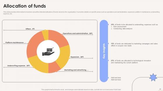 This slide provides information to investors about the intended utilization of funds raised by the organization. It provides details on specific areas such as operations and administration, expansion, platform maintenance, underwriting expense, etc. Find a pre-designed and impeccable Allocation Of Funds Term Life Insurance Platform Investor Funding Elevator Pitch Deck. The templates can ace your presentation without additional effort. You can download these easy-to-edit presentation templates to make your presentation stand out from others. So, what are you waiting for Download the template from Slidegeeks today and give a unique touch to your presentation. This slide provides information to investors about the intended utilization of funds raised by the organization. It provides details on specific areas such as operations and administration, expansion, platform maintenance, underwriting expense, etc.