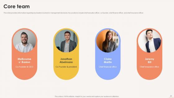 This slide provides information regarding key leaders involved in management decisions. Key positions include chief executive officer, co-founder, chief finance officer, and chief insurance officer. Do you have to make sure that everyone on your team knows about any specific topic I yes, then you should give Core Team Term Life Insurance Platform Investor Funding Elevator Pitch Deck a try. Our experts have put a lot of knowledge and effort into creating this impeccable Core Team Term Life Insurance Platform Investor Funding Elevator Pitch Deck. You can use this template for your upcoming presentations, as the slides are perfect to represent even the tiniest detail. You can download these templates from the Slidegeeks website and these are easy to edit. So grab these today This slide provides information regarding key leaders involved in management decisions. Key positions include chief executive officer, co-founder, chief finance officer, and chief insurance officer.