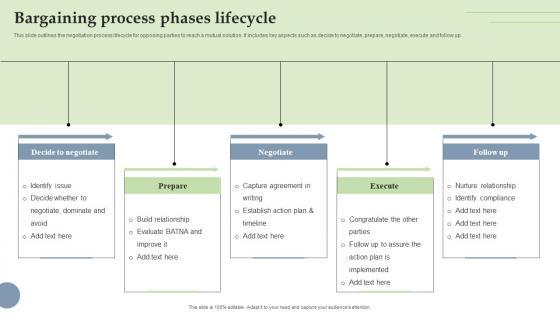 This slide outlines the negotiation process lifecycle for opposing parties to reach a mutual solution. It includes key aspects such as decide to negotiate, prepare, negotiate, execute and follow up. Pitch your topic with ease and precision using this Bargaining Process Phases Lifecycle Clipart Pdf. This layout presents information on Decide To Negotiate, Prepare, Execute. It is also available for immediate download and adjustment. So, changes can be made in the color, design, graphics or any other component to create a unique layout. This slide outlines the negotiation process lifecycle for opposing parties to reach a mutual solution. It includes key aspects such as decide to negotiate, prepare, negotiate, execute and follow up.