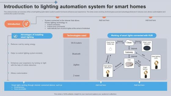 This slide provides an overview of the smart lighting automation system used in homes to enhance user experience. The slide covers working, technologies used and advantages that are it reduces cost, allows customization and controls the system remotely. Take your projects to the next level with our ultimate collection of Introduction To Lighting Automation System For Smart Homes Utilizing Smart Appliances IoT SS V. Slidegeeks has designed a range of layouts that are perfect for representing task or activity duration, keeping track of all your deadlines at a glance. Tailor these designs to your exact needs and give them a truly corporate look with your own brand colors they will make your projects stand out from the rest This slide provides an overview of the smart lighting automation system used in homes to enhance user experience. The slide covers working, technologies used and advantages that are it reduces cost, allows customization and controls the system remotely.