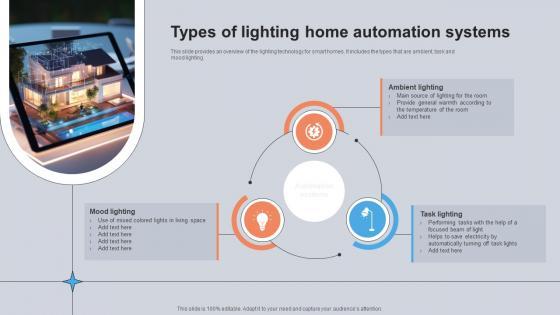 This slide provides an overview of the lighting technology for smart homes. It includes the types that are ambient, task and mood lighting. Slidegeeks is here to make your presentations a breeze with Types Of Lighting Home Automation Systems Utilizing Smart Appliances IoT SS V With our easy-to-use and customizable templates, you can focus on delivering your ideas rather than worrying about formatting. With a variety of designs to choose from, you are sure to find one that suits your needs. And with animations and unique photos, illustrations, and fonts, you can make your presentation pop. So whether you are giving a sales pitch or presenting to the board, make sure to check out Slidegeeks first This slide provides an overview of the lighting technology for smart homes. It includes the types that are ambient, task and mood lighting.