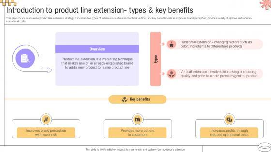 This slide covers overview to product line extension strategy. It involves two types of extensions such as horizontal and vertical, and key benefits such as improves brand perception, provides variety of options and reduces operational costs. Slidegeeks is here to make your presentations a breeze with Brand Extension Techniques To Introduction To Product Line Extension Types And Key Strategy SS V With our easy-to-use and customizable templates, you can focus on delivering your ideas rather than worrying about formatting. With a variety of designs to choose from, you are sure to find one that suits your needs. And with animations and unique photos, illustrations, and fonts, you can make your presentation pop. So whether you are giving a sales pitch or presenting to the board, make sure to check out Slidegeeks first This slide covers overview to product line extension strategy. It involves two types of extensions such as horizontal and vertical, and key benefits such as improves brand perception, provides variety of options and reduces operational costs.