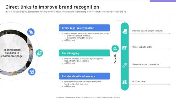 This slide showcases techniques and benefits of creating direct links that are it Improve search engine ranking, Boost website traffic, Generate more conversions, etc. Do you have an important presentation coming up Are you looking for something that will make your presentation stand out from the rest Look no further than Building Stronger Customer Direct Links To Improve Brand Recognition SA SS V. With our professional designs, you can trust that your presentation will pop and make delivering it a smooth process. And with Slidegeeks, you can trust that your presentation will be unique and memorable. So why wait Grab Building Stronger Customer Direct Links To Improve Brand Recognition SA SS V today and make your presentation stand out from the rest This slide showcases techniques and benefits of creating direct links that are it Improve search engine ranking, Boost website traffic, Generate more conversions, etc.