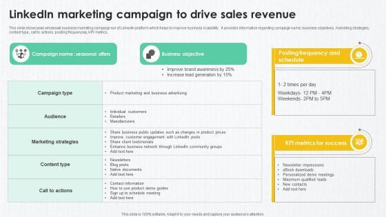 This slide showcases wholesale business marketing campaign run of LinkedIn platform which helps to improve business scalability . It provides information regarding campaign name, business objectives, marketing strategies, content type, call to actions, posting frequencies, KPI metrics. Whether you have daily or monthly meetings, a brilliant presentation is necessary. B2B Marketing Techniques Linkedin Marketing Campaign To Drive Sales Revenue can be your best option for delivering a presentation. Represent everything in detail using B2B Marketing Techniques Linkedin Marketing Campaign To Drive Sales Revenue and make yourself stand out in meetings. The template is versatile and follows a structure that will cater to your requirements. All the templates prepared by Slidegeeks are easy to download and edit. Our research experts have taken care of the corporate themes as well. So, give it a try and see the results. This slide showcases wholesale business marketing campaign run of LinkedIn platform which helps to improve business scalability . It provides information regarding campaign name, business objectives, marketing strategies, content type, call to actions, posting frequencies, KPI metrics.