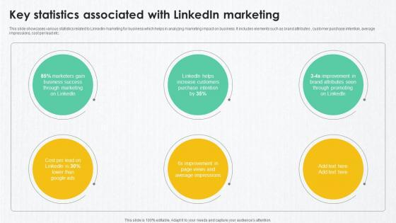This slide showcases various statistics related to LinkedIn marketing for business which helps in analyzing marketing impact on business. It includes elements such as brand attributes , customer purchase intention, average impressions, cost per lead etc. Boost your pitch with our creative B2B Marketing Techniques To Increase Key Statistics Associated With Linkedin Marketing. Deliver an awe-inspiring pitch that will mesmerize everyone. Using these presentation templates you will surely catch everyones attention. You can browse the ppts collection on our website. We have researchers who are experts at creating the right content for the templates. So you do not have to invest time in any additional work. Just grab the template now and use them. This slide showcases various statistics related to LinkedIn marketing for business which helps in analyzing marketing impact on business. It includes elements such as brand attributes , customer purchase intention, average impressions, cost per lead etc.