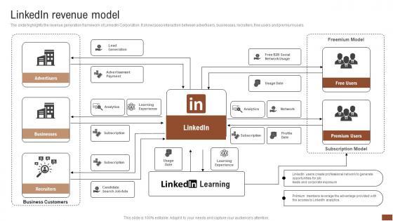 The slide highlights the revenue generation framework of LinkedIn Corporation. It showcases interaction between advertisers, businesses, recruiters, free users and premium users. Whether you have daily or monthly meetings, a brilliant presentation is necessary. Linkedin Revenue Model Talent Recruitment Company Outline Microsoft Pdf can be your best option for delivering a presentation. Represent everything in detail using Linkedin Revenue Model Talent Recruitment Company Outline Microsoft Pdf and make yourself stand out in meetings. The template is versatile and follows a structure that will cater to your requirements. All the templates prepared by Slidegeeks are easy to download and edit. Our research experts have taken care of the corporate themes as well. So, give it a try and see the results. The slide highlights the revenue generation framework of LinkedIn Corporation. It showcases interaction between advertisers, businesses, recruiters, free users and premium users.