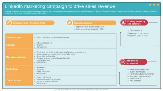 This slide showcases wholesale business marketing campaign run of LinkedIn platform which helps to improve business scalability . It provides information regarding campaign name, business objectives, marketing strategies, content type, call to actions, posting frequencies, KPI metrics. Whether you have daily or monthly meetings, a brilliant presentation is necessary. B2B Marketing Techniques Linkedin Marketing Campaign To Drive Sales Revenue can be your best option for delivering a presentation. Represent everything in detail using B2B Marketing Techniques Linkedin Marketing Campaign To Drive Sales Revenue and make yourself stand out in meetings. The template is versatile and follows a structure that will cater to your requirements. All the templates prepared by Slidegeeks are easy to download and edit. Our research experts have taken care of the corporate themes as well. So, give it a try and see the results. This slide showcases wholesale business marketing campaign run of LinkedIn platform which helps to improve business scalability . It provides information regarding campaign name, business objectives, marketing strategies, content type, call to actions, posting frequencies, KPI metrics.