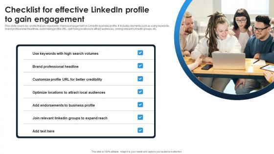 This slide covers key points that are required to improve engagement on LinkedIn business profile. It includes elements such as using keywords, brand professional headlines, customizing profile URL, optimizing locations to attract audiences, joining relevant LinkedIn groups, etc. From laying roadmaps to briefing everything in detail, our templates are perfect for you. You can set the stage with your presentation slides. All you have to do is download these easy-to-edit and customizable templates. Linkedin Content Strategies Checklist For Effective Linkedin Profile To Gain MKT SS V will help you deliver an outstanding performance that everyone would remember and praise you for. Do download this presentation today. This slide covers key points that are required to improve engagement on LinkedIn business profile. It includes elements such as using keywords, brand professional headlines, customizing profile URL, optimizing locations to attract audiences, joining relevant LinkedIn groups, etc.