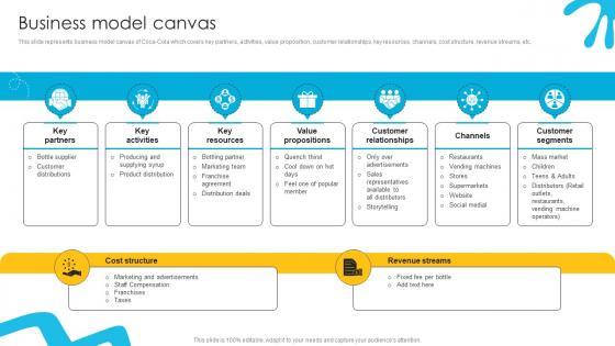 This slide represents business model canvas of Coca-Cola which covers key partners, activities, value proposition, customer relationships, key resources, channels, cost structure, revenue streams, etc. Get a simple yet stunning designed Business Model Canvas Liquid Refreshment Manufacturer Company Profile Ppt Template CP SS V. It is the best one to establish the tone in your meetings. It is an excellent way to make your presentations highly effective. So, download this PPT today from Slidegeeks and see the positive impacts. Our easy-to-edit Business Model Canvas Liquid Refreshment Manufacturer Company Profile Ppt Template CP SS V can be your go-to option for all upcoming conferences and meetings. So, what are you waiting for Grab this template today. This slide represents business model canvas of Coca-Cola which covers key partners, activities, value proposition, customer relationships, key resources, channels, cost structure, revenue streams, etc.