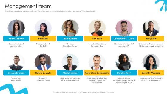 This slide represents the management team of Coca-Cola which includes different positions such as chairman, CEO, executive etc. Find highly impressive Management Team Liquid Refreshment Manufacturer Company Profile Ppt Template CP SS V on Slidegeeks to deliver a meaningful presentation. You can save an ample amount of time using these presentation templates. No need to worry to prepare everything from scratch because Slidegeeks experts have already done a huge research and work for you. You need to download Management Team Liquid Refreshment Manufacturer Company Profile Ppt Template CP SS V for your upcoming presentation. All the presentation templates are 100 percent editable and you can change the color and personalize the content accordingly. Download now This slide represents the management team of Coca-Cola which includes different positions such as chairman, CEO, executive etc.