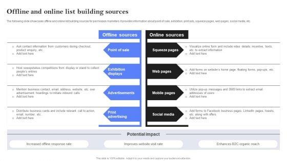 The following slide showcases offline and online list building sources for permission marketers. It provides information about point of sale, exhibition, print ads, squeeze pages, web pages, social media, etc. Explore a selection of the finest Offline And Online List Building Sources Ppt PowerPoint Presentation File Inspiration PDF here. With a plethora of professionally designed and pre made slide templates, you can quickly and easily find the right one for your upcoming presentation. You can use our Offline And Online List Building Sources Ppt PowerPoint Presentation File Inspiration PDF to effectively convey your message to a wider audience. Slidegeeks has done a lot of research before preparing these presentation templates. The content can be personalized and the slides are highly editable. Grab templates today from Slidegeeks.