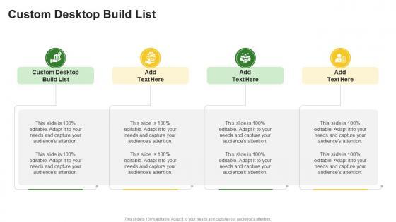 Introducing our well-designed Custom Desktop Build List In Powerpoint And Google Slides Cpb. This PowerPoint design presents information on topics like Custom Desktop Build List. As it is predesigned it helps boost your confidence level. It also makes you a better presenter because of its high-quality content and graphics. This PPT layout can be downloaded and used in different formats like PDF, PNG, and JPG. Not only this, it is available in both Standard Screen and Widescreen aspect ratios for your convenience. Therefore, click on the download button now to persuade and impress your audience. Our Custom Desktop Build List In Powerpoint And Google Slides Cpb are topically designed to provide an attractive backdrop to any subject. Use them to look like a presentation pro.
