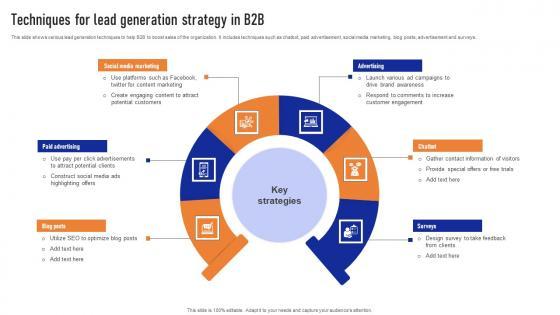 This slide shows various lead generation techniques to help B2B to boost sales of the organization. It includes techniques such as chatbot, paid advertisement, social media marketing, blog posts, advertisement and surveys. Pitch your topic with ease and precision using this Techniques For Lead Generation Strategy In B2b Ppt Diagram Lists Pdf. This layout presents information on Paid Advertisement, Social Media Marketing, Blog Posts. It is also available for immediate download and adjustment. So, changes can be made in the color, design, graphics or any other component to create a unique layout. This slide shows various lead generation techniques to help B2B to boost sales of the organization. It includes techniques such as chatbot, paid advertisement, social media marketing, blog posts, advertisement and surveys.