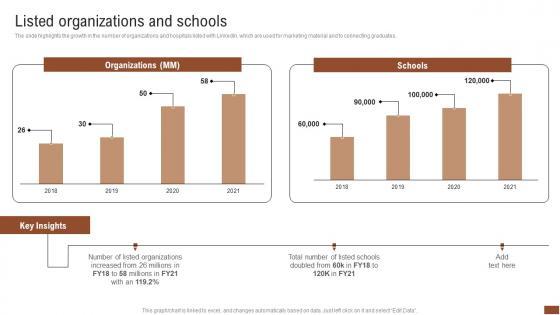 The slide highlights the growth in the number of organizations and hospitals listed with LinkedIn, which are used for marketing material and to connecting graduates. This modern and well arranged Business Connection Network Company Outline Listed Organizations And Schools Download PDF provides lots of creative possibilities. It is very simple to customize and edit with the Powerpoint Software. Just drag and drop your pictures into the shapes. All facets of this template can be edited with Powerpoint no extra software is necessary. Add your own material, put your images in the places assigned for them, adjust the colors, and then you can show your slides to the world, with an animated slide included.