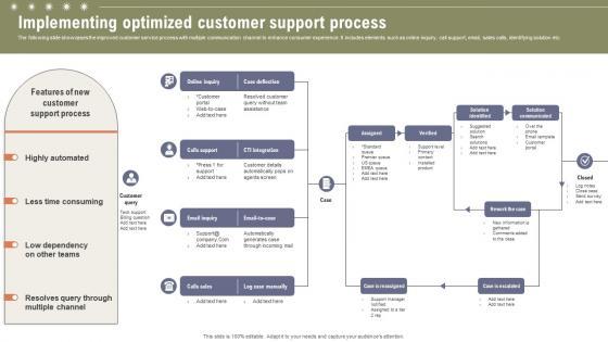 The following slide showcases the improved customer service process with multiple communication channel to enhance consumer experience. It includes elements such as online inquiry, call support, email, sales calls, identifying solution etc. Crafting an eye-catching presentation has never been more straightforward. Let your presentation shine with this tasteful yet straightforward Implementing Optimized Customer Boosting Customer Retention Rate With Live Chat template. It offers a minimalistic and classy look that is great for making a statement. The colors have been employed intelligently to add a bit of playfulness while still remaining professional. Construct the ideal Implementing Optimized Customer Boosting Customer Retention Rate With Live Chat that effortlessly grabs the attention of your audience Begin now and be certain to wow your customers The following slide showcases the improved customer service process with multiple communication channel to enhance consumer experience. It includes elements such as online inquiry, call support, email, sales calls, identifying solution etc.