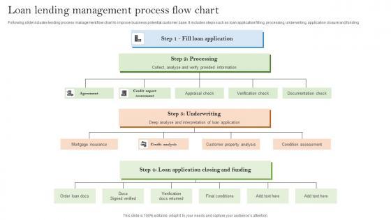 Following slide includes lending process management flow chart to improve business potential customer base. It includes steps such as loan application filling, processing, underwriting, application closure and funding Showcasing this set of slides titled Loan Lending Management Process Flow Chart Portrait Pdf. The topics addressed in these templates are Processing, Application, Underwriting. All the content presented in this PPT design is completely editable. Download it and make adjustments in color, background, font etc. as per your unique business setting. Following slide includes lending process management flow chart to improve business potential customer base. It includes steps such as loan application filling, processing, underwriting, application closure and funding