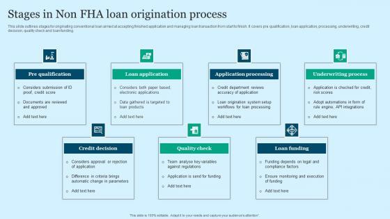 This slide outlines stages for originating conventional loan aimed at accepting finished application and managing loan transaction from start to finish. It covers pre qualification, loan application, processing, underwriting, credit decision, quality check and loan funding. Pitch your topic with ease and precision using this Stages In Non FHA Loan Origination Process Sample Pdf. This layout presents information on Loan Application, Application Processing, Underwriting Process. It is also available for immediate download and adjustment. So, changes can be made in the color, design, graphics or any other component to create a unique layout. This slide outlines stages for originating conventional loan aimed at accepting finished application and managing loan transaction from start to finish. It covers pre qualification, loan application, processing, underwriting, credit decision, quality check and loan funding.