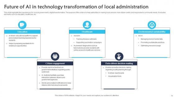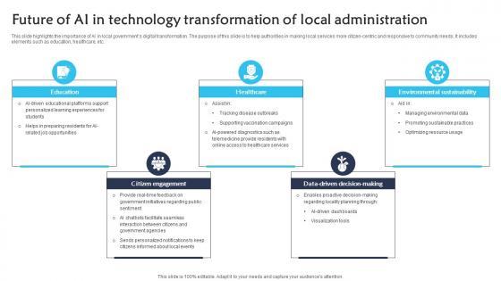 This slide highlights the importance of AI in local governments digital transformation. The purpose of this slide is to help authorities in making local services more citizen-centric and responsive to community needs. It includes elements such as education, healthcare, etc. Showcasing this set of slides titled Future Of AI In Technology Transformation Of Local Administration Mockup pdf. The topics addressed in these templates are Education, Healthcare, Environmental Sustainability. All the content presented in this PPT design is completely editable. Download it and make adjustments in color, background, font etc. as per your unique business setting. This slide highlights the importance of AI in local governments digital transformation. The purpose of this slide is to help authorities in making local services more citizen-centric and responsive to community needs. It includes elements such as education, healthcare, etc.