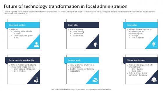 This slide highlights opportunities of digital transformation for local government. The purpose of this slide is to help the council improve its way of serving local residents and other community stakeholders. It includes elements such as smart cities, innovation, etc. Pitch your topic with ease and precision using this Future Of Technology Transformation In Local Administration Background pdf. This layout presents information on Improved Services, Smart Cities, Innovation. It is also available for immediate download and adjustment. So, changes can be made in the color, design, graphics or any other component to create a unique layout. This slide highlights opportunities of digital transformation for local government. The purpose of this slide is to help the council improve its way of serving local residents and other community stakeholders. It includes elements such as smart cities, innovation, etc.