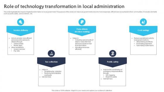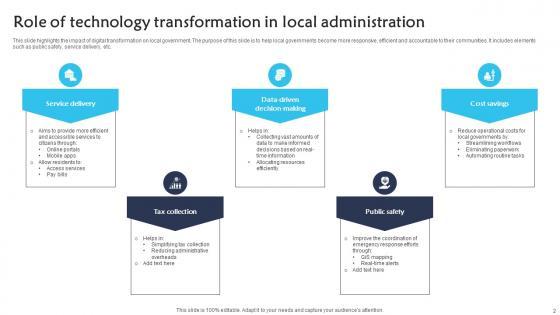 This slide highlights the impact of digital transformation on local government. The purpose of this slide is to help local governments become more responsive, efficient and accountable to their communities. It includes elements such as public safety, service delivery, etc. Showcasing this set of slides titled Role Of Technology Transformation In Local Administration Infographics pdf. The topics addressed in these templates are Cost Savings, Tax Collection, Public Safety. All the content presented in this PPT design is completely editable. Download it and make adjustments in color, background, font etc. as per your unique business setting. This slide highlights the impact of digital transformation on local government. The purpose of this slide is to help local governments become more responsive, efficient and accountable to their communities. It includes elements such as public safety, service delivery, etc.