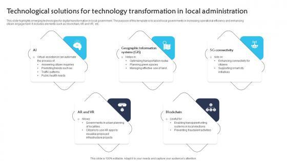 This slide highlights emerging technologies for digital transformation in local government. The purpose of this template is to assist local governments in increasing operational efficiency and enhancing citizen engagement. It includes elements such as blockchain, AR and VR, etc. Showcasing this set of slides titled Technological Solutions For Technology Transformation In Local Administration Information pdf. The topics addressed in these templates are AI, Geographic Information Systems, 5G Connectivity. All the content presented in this PPT design is completely editable. Download it and make adjustments in color, background, font etc. as per your unique business setting. This slide highlights emerging technologies for digital transformation in local government. The purpose of this template is to assist local governments in increasing operational efficiency and enhancing citizen engagement. It includes elements such as blockchain, AR and VR, etc.