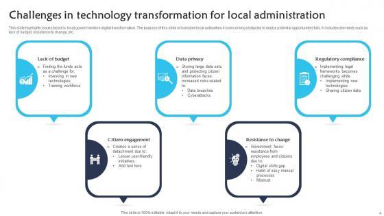This slide highlights issues faced by local governments in digital transformation. The purpose of this slide is to enable local authorities in overcoming obstacles to realize potential opportunities fully. It includes elements such as lack of budget, resistance to change, etc. Showcasing this set of slides titled Challenges In Technology Transformation For Local Administration Download pdf. The topics addressed in these templates are Data Privacy, Regulatory Compliance, Resistance To Change, Citizen Engagement. All the content presented in this PPT design is completely editable. Download it and make adjustments in color, background, font etc. as per your unique business setting. This slide highlights issues faced by local governments in digital transformation. The purpose of this slide is to enable local authorities in overcoming obstacles to realize potential opportunities fully. It includes elements such as lack of budget, resistance to change, etc.