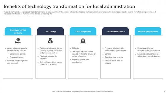 This slide highlights the advantages of digital transformation for local government. The purpose of this slide is to assist municipal authorities in navigating the challenges to reap the rewards from effective implementation. It includes elements such as improved service delivery, cost saving, etc. Showcasing this set of slides titled Benefits Of Technology Transformation For Local Administration Microsoft pdf. The topics addressed in these templates are Improved Service Delivery, Cost Savings, Data Integration. All the content presented in this PPT design is completely editable. Download it and make adjustments in color, background, font etc. as per your unique business setting. This slide highlights the advantages of digital transformation for local government. The purpose of this slide is to assist municipal authorities in navigating the challenges to reap the rewards from effective implementation. It includes elements such as improved service delivery, cost saving, etc.