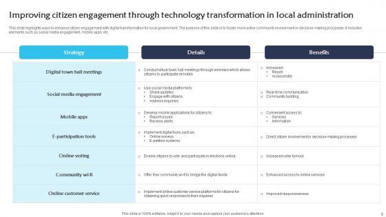 This slide highlights ways to enhance citizen engagement with digital transformation for local government. The purpose of this slide is to foster more active community involvement in decision-making processes. It includes elements such as social media engagement, mobile apps, etc. Pitch your topic with ease and precision using this Improving Citizen Engagement Through Technology Transformation In Local Administration Slides pdf. This layout presents information on Strategy, Details, Benefits. It is also available for immediate download and adjustment. So, changes can be made in the color, design, graphics or any other component to create a unique layout. This slide highlights ways to enhance citizen engagement with digital transformation for local government. The purpose of this slide is to foster more active community involvement in decision-making processes. It includes elements such as social media engagement, mobile apps, etc.