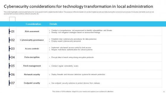 This slide highlights cybersecurity factors for local governments digital transformation. The purpose of this template is to protect digital assets and data during the conversion processes. It includes elements such as risk assessment, access controls, network security, etc. Showcasing this set of slides titled Cybersecurity Considerations For Technology Transformation In Local Administration Topics pdf. The topics addressed in these templates are Risk Assessment, Cybersecurity Governance, Access Controls. All the content presented in this PPT design is completely editable. Download it and make adjustments in color, background, font etc. as per your unique business setting. This slide highlights cybersecurity factors for local governments digital transformation. The purpose of this template is to protect digital assets and data during the conversion processes. It includes elements such as risk assessment, access controls, network security, etc.