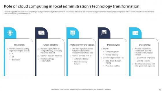 This slide highlights the use of cloud computing in local governments digital transformation. The purpose of this slide is to empower local governments in meeting the evolving needs of their communities. It includes elements such as innovation, green initiatives, etc. Pitch your topic with ease and precision using this Role Of Cloud Computing In Local Administrations Technology Transformation Diagrams pdf. This layout presents information on Innovation, Green Initiatives, Data Analytics, Data Sharing. It is also available for immediate download and adjustment. So, changes can be made in the color, design, graphics or any other component to create a unique layout. This slide highlights the use of cloud computing in local governments digital transformation. The purpose of this slide is to empower local governments in meeting the evolving needs of their communities. It includes elements such as innovation, green initiatives, etc.