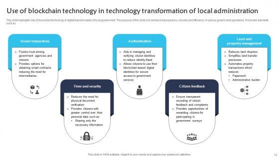 This slide highlights role of blockchain technology in digital transformation of local government. The purpose of this slide is to enhance transparency, security and efficiency in various government operations. It includes elements such as. Showcasing this set of slides titled Use Of Blockchain Technology In Technology Transformation Of Local Administration Infographics pdf. The topics addressed in these templates are Secure Transactions, Authentication, Citizen Feedback, Time And Security. All the content presented in this PPT design is completely editable. Download it and make adjustments in color, background, font etc. as per your unique business setting. This slide highlights role of blockchain technology in digital transformation of local government. The purpose of this slide is to enhance transparency, security and efficiency in various government operations. It includes elements such as.