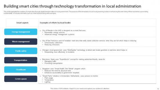 This slide highlights the creation of smart cities through digital transformation in local government. The purpose of this template is to aid local governing bodies in enhancing the well-being of their residents by promoting sustainability. It includes elements such as smart aspects along with examples. Pitch your topic with ease and precision using this Building Smart Cities Through Technology Transformation In Local Administration Themes pdf. This layout presents information on Energy Management, Waste Management, Public Safety. It is also available for immediate download and adjustment. So, changes can be made in the color, design, graphics or any other component to create a unique layout. This slide highlights the creation of smart cities through digital transformation in local government. The purpose of this template is to aid local governing bodies in enhancing the well-being of their residents by promoting sustainability. It includes elements such as smart aspects along with examples.