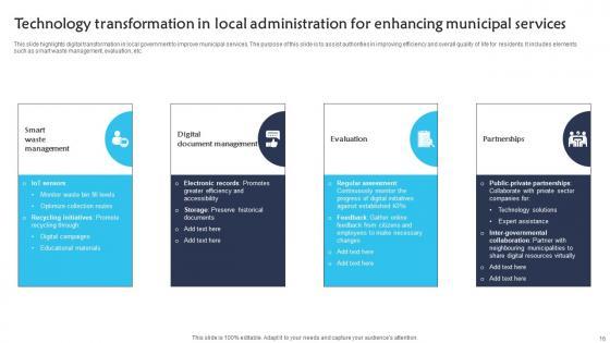 This slide highlights digital transformation in local government to improve municipal services. The purpose of this slide is to assist authorities in improving efficiency and overall quality of life for residents. It includes elements such as smart waste management, evaluation, etc. Pitch your topic with ease and precision using this Technology Transformation In Local Administration For Enhancing Municipal Services Information pdf. This layout presents information on Smart Waste Management, Digital Document Management, Evaluation. It is also available for immediate download and adjustment. So, changes can be made in the color, design, graphics or any other component to create a unique layout. This slide highlights digital transformation in local government to improve municipal services. The purpose of this slide is to assist authorities in improving efficiency and overall quality of life for residents. It includes elements such as smart waste management, evaluation, etc.