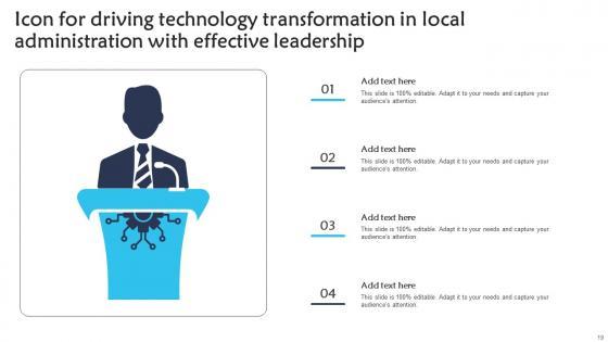 Showcasing this set of slides titled Icon For Driving Technology Transformation In Local Administration With Effective Leadership Diagrams pdf. The topics addressed in these templates are Icon, Driving Technology Transformation, Local Administration, Effective Leadership. All the content presented in this PPT design is completely editable. Download it and make adjustments in color, background, font etc. as per your unique business setting. Our Icon For Driving Technology Transformation In Local Administration With Effective Leadership Diagrams pdf are topically designed to provide an attractive backdrop to any subject. Use them to look like a presentation pro.