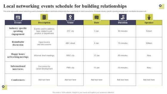 This This slide represents career networking event schedule for network distributors that provide them opportunity to build connections. It include industry specific speaking engagement, roundtable discussion etc. Coming up with a presentation necessitates that the majority of the effort goes into the content and the message you intend to convey. The visuals of a PowerPoint presentation can only be effective if it supplements and supports the story that is being told. Keeping this in mind our experts created Local Networking Events Schedule Strategic Plan Develop Multi Level Marketing Diagrams Pdf to reduce the time that goes into designing the presentation. This way, you can concentrate on the message while our designers take care of providing you with the right template for the situation. This This slide represents career networking event schedule for network distributors that provide them opportunity to build connections. It include industry specific speaking engagement, roundtable discussion etc.