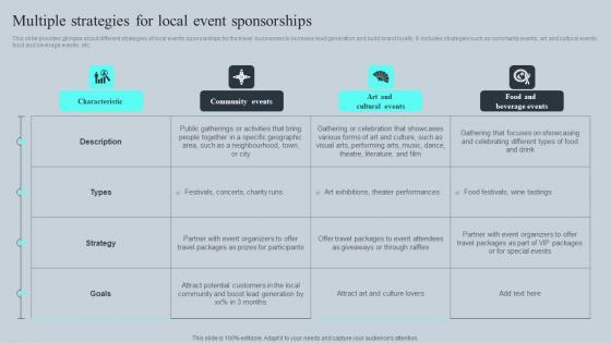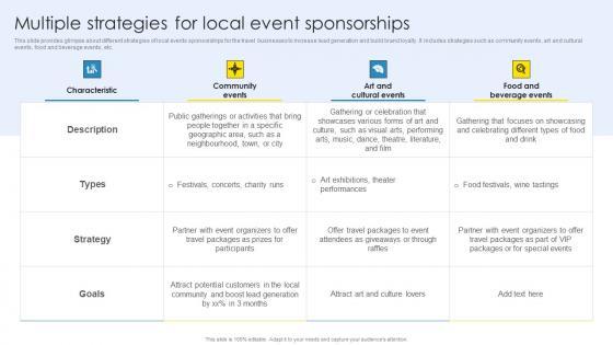 This slide provides glimpse about different strategies of local events sponsorships for the travel businesses to increase lead generation and build brand loyalty. It includes strategies such as community events, art and cultural events, food and beverage events, etc. Do you have to make sure that everyone on your team knows about any specific topic I yes, then you should give Tour And Travel Agency Marketing Multiple Strategies For Local Event Sponsorships Sample PDF a try. Our experts have put a lot of knowledge and effort into creating this impeccable Tour And Travel Agency Marketing Multiple Strategies For Local Event Sponsorships Sample PDF. You can use this template for your upcoming presentations, as the slides are perfect to represent even the tiniest detail. You can download these templates from the Slidegeeks website and these are easy to edit. So grab these today.