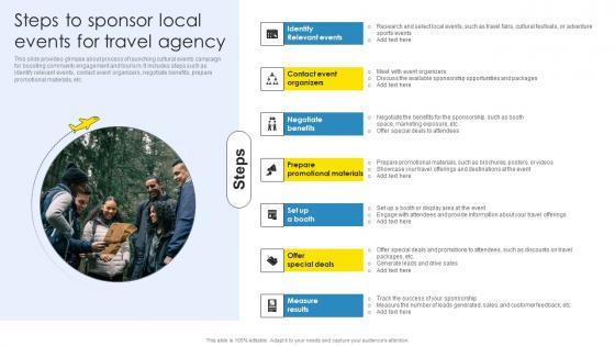 This slide provides glimpse about process of launching cultural events campaign for boosting community engagement and tourism. It includes steps such as identify relevant events, contact event organizers, negotiate benefits, prepare promotional materials, etc. From laying roadmaps to briefing everything in detail, our templates are perfect for you. You can set the stage with your presentation slides. All you have to do is download these easy-to-edit and customizable templates. Steps To Sponsor Local Events For Travel Tours And Travel Business Advertising Professional Pdf will help you deliver an outstanding performance that everyone would remember and praise you for. Do download this presentation today. This slide provides glimpse about process of launching cultural events campaign for boosting community engagement and tourism. It includes steps such as identify relevant events, contact event organizers, negotiate benefits, prepare promotional materials, etc.