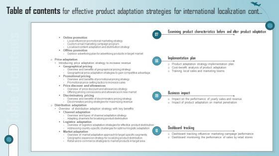 Whether you have daily or monthly meetings, a brilliant presentation is necessary. Table Of Contents For Effective Product Adaptation Strategies For International Localization Infographics Pdf can be your best option for delivering a presentation. Represent everything in detail using Table Of Contents For Effective Product Adaptation Strategies For International Localization Infographics Pdf and make yourself stand out in meetings. The template is versatile and follows a structure that will cater to your requirements. All the templates prepared by Slidegeeks are easy to download and edit. Our research experts have taken care of the corporate themes as well. So, give it a try and see the results. Our Table Of Contents For Effective Product Adaptation Strategies For International Localization Infographics Pdf are topically designed to provide an attractive backdrop to any subject. Use them to look like a presentation pro.