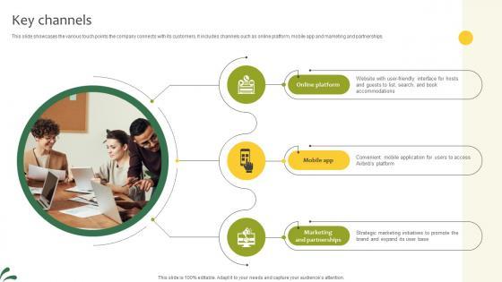 This slide showcases the various touch points the company connects with its customers. It includes channels such as online platform, mobile app and marketing and partnerships. From laying roadmaps to briefing everything in detail, our templates are perfect for you. You can set the stage with your presentation slides. All you have to do is download these easy-to-edit and customizable templates. Key Channels Lodging And Breakfast Business Model BMC SS V will help you deliver an outstanding performance that everyone would remember and praise you for. Do download this presentation today. This slide showcases the various touch points the company connects with its customers. It includes channels such as online platform, mobile app and marketing and partnerships.