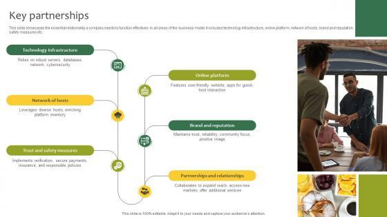 This slide showcases the essential relationship a company needs to function effectively in all areas of the business model. It includes technology infrastructure, online platform, network of hosts, brand and reputation, safety measures etc. Present like a pro with Key Partnerships Lodging And Breakfast Business Model BMC SS V. Create beautiful presentations together with your team, using our easy-to-use presentation slides. Share your ideas in real-time and make changes on the fly by downloading our templates. So whether you are in the office, on the go, or in a remote location, you can stay in sync with your team and present your ideas with confidence. With Slidegeeks presentation got a whole lot easier. Grab these presentations today. This slide showcases the essential relationship a company needs to function effectively in all areas of the business model. It includes technology infrastructure, online platform, network of hosts, brand and reputation, safety measures etc.